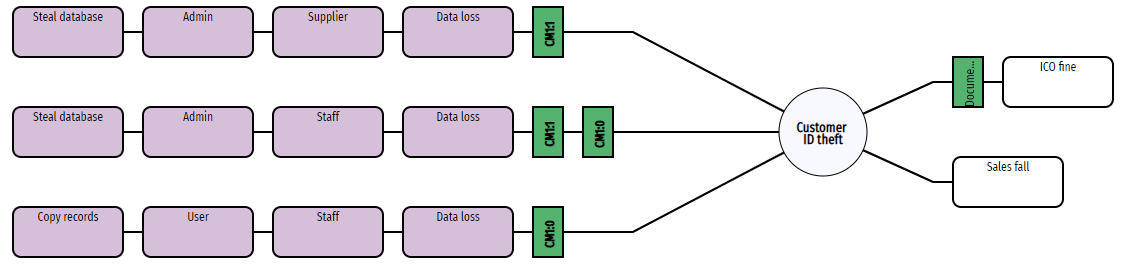 The example above shows a simple bow-tie diagram with three risks leading to the outcome, and two consequences. The diagram illustrates the risks that lead to the loss of customer data, which is then used for identity theft. The is results in a fine from the ICO and a loss of sales. There are two countermeasures across the three risks (CM1:0 and CM1:1), and one mitigation against the consequence of ICO fine.