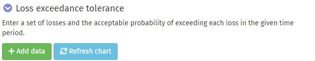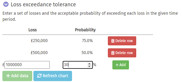 You can add a loss exceedance tolerance curve to your graph. Open the section above the risk table by clicking on Loss exceedance tolerance. Enter values by clicking on the green button, and typing in a pair of values representing a loss, and the percentage chance that the risk would be acceptable. Click on the green button to confirm the data. Repeat until you have entered all of your values, and then click the blue button to create a new chart including your loss exceedance tolerance curve. If you make a mistake entering data, click on the red green button.