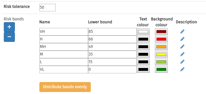 The example above shows a custom configuration with five risk bands. The lowest band has been coloured blue, and the bands are not even distributed across the scale. If you do want them to be evenly distributed, click on the button.