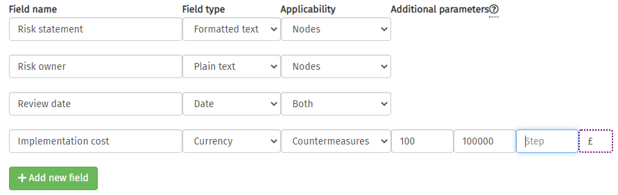 The data types of number, percentage, currency, and list will prompt you for additional parameters. These are optional, except if the field has a dotted purple border (for example, the currency symbol in the picture above). You can use these parameters to set minimum and maximum values, and a step (i.e., increment) for the numeric fields. Currency requires a symbol of up to three characters, and list requires a comma-separated list of values to use.