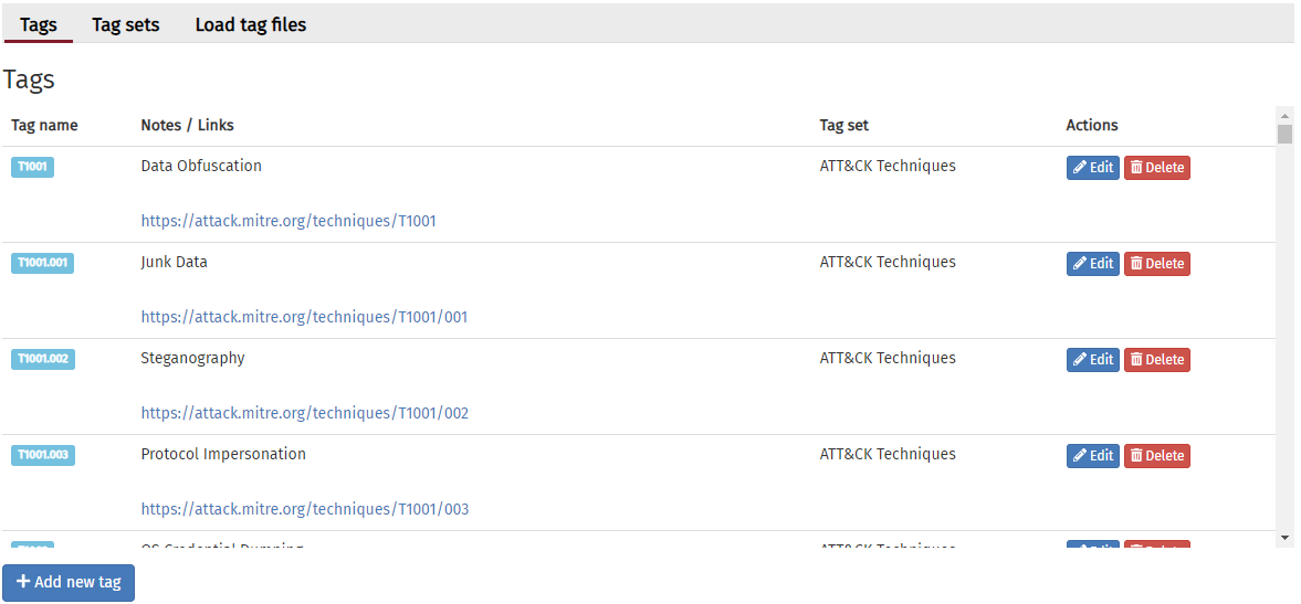 To delete a tag, either click on the button in the row for the appropriate tag, or, whilst editing the tag, click the Delete tag button in the tag editor.